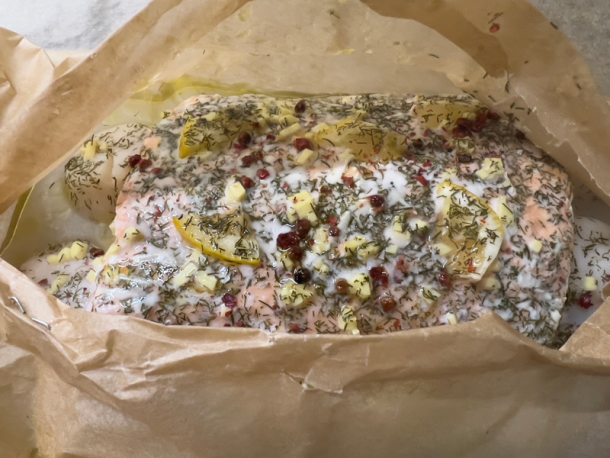 Répartissez l'ail émincé, les baies roses, l'aneth ciselé, et les morceaux de citron sur le saumon et les Saint-Jacques. Salez, poivrez
