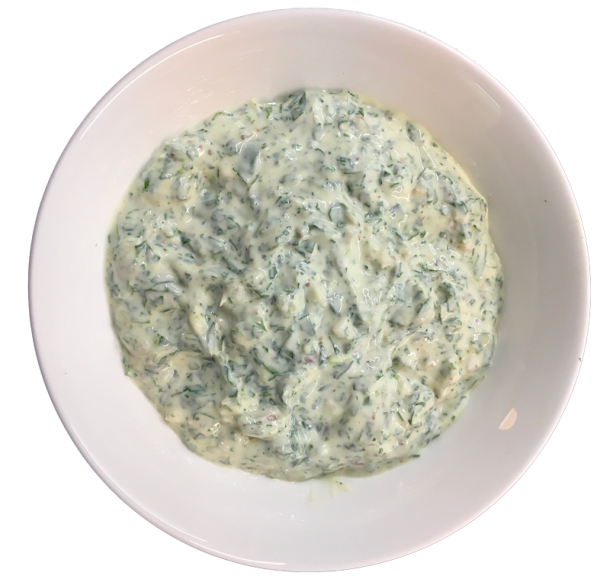 Mélanger le yaourt, l'ail écrasé ainsi que la ciboulette et le persil haché. Ajuster à votre goût en rajoutant très peu de moutarde, ainsi qu'un peu de sel et de poivre.